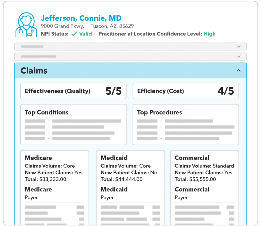 If you’re debating about which providers will help you improve clinical quality, QES Provider Claims Insights can help. Our proprietary, comprehensive database includes more than 5 billion annual medical and pharmaceutical claims, plus additional provider performance metrics through Quest Analytics’ partnership with Arcadia’s CareJourney and Motive Practicing Wisely. Drawing on this wealth of data, you can quickly analyze providers’ clinical activity, top conditions and procedures, and efficiency and effectiveness scores, giving you a much deeper understanding of which providers will add the most value to your network. You can also assess the cost, quality, and payer mix, helping you determine which providers to prioritize for contracting.